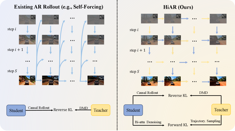방법론: 기존 오토리그레시브 비디오 생성은 이전 청크를 거의 완전히 디노이즈한 후 다음 청크의 컨텍스트로 사용하여 에러 누적(temporal drift) 발생. HiAR는 컨텍스트를 현재 청크와 동일한 노이즈 레벨에서 제공하는 계층적 디노이징 방식을 도입. Forward-KL 정규화로 모션 다양성 보존.